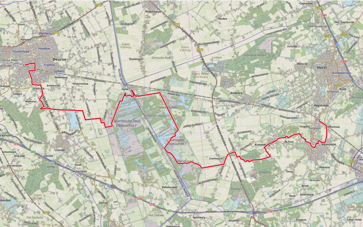 Van Sevenum ga je langs de meanderende Blakterbeek naar Kronenberg en via natuurgebied Heemsberg naar Evertsoord. Hier begint het veengebied met Helenaveen en Griendtsveen als voormalige veenkoloniën. Je doorkruist de Mariapeel, het grootste resterende natte hoogveengebied van zuidelijk Nederland.