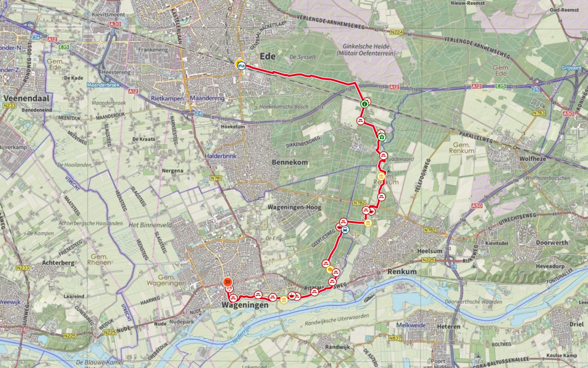 Het uitgestrekte bos De Sysselt, de slingerende Molenbeek en de Wageningse Berg – met weids uitzicht op Rijn en Betuwe – vormen de hoofdingrediënten van deze route.